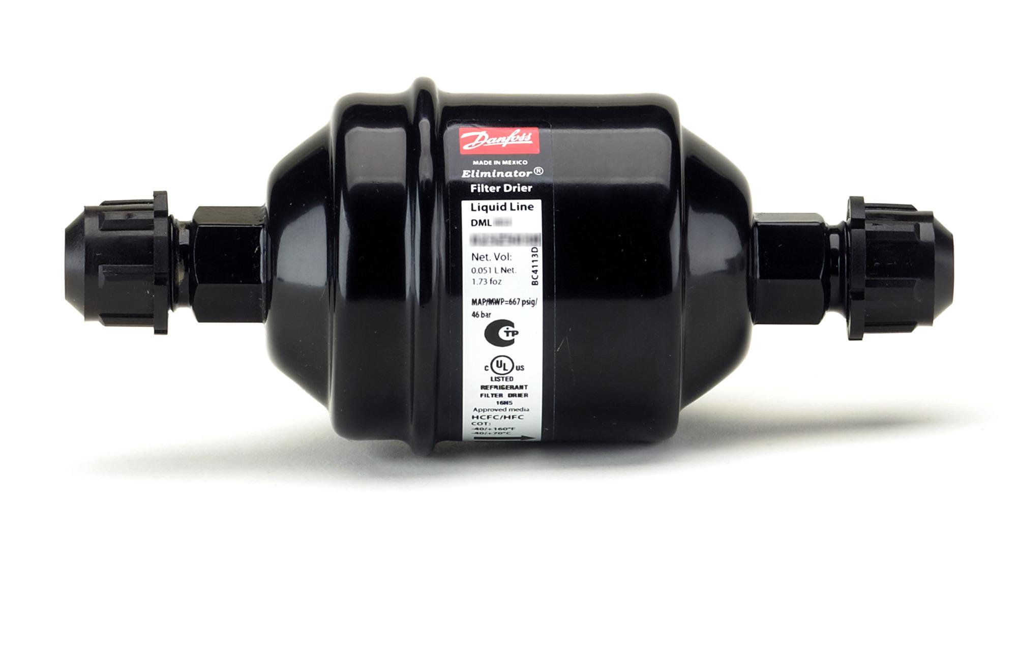 Hermetic filter drier, DML, 05 cu.in., Steel. Inlet connection type: Flare, Outlet connection type: Flare, Core Size code: 05 cu.in.