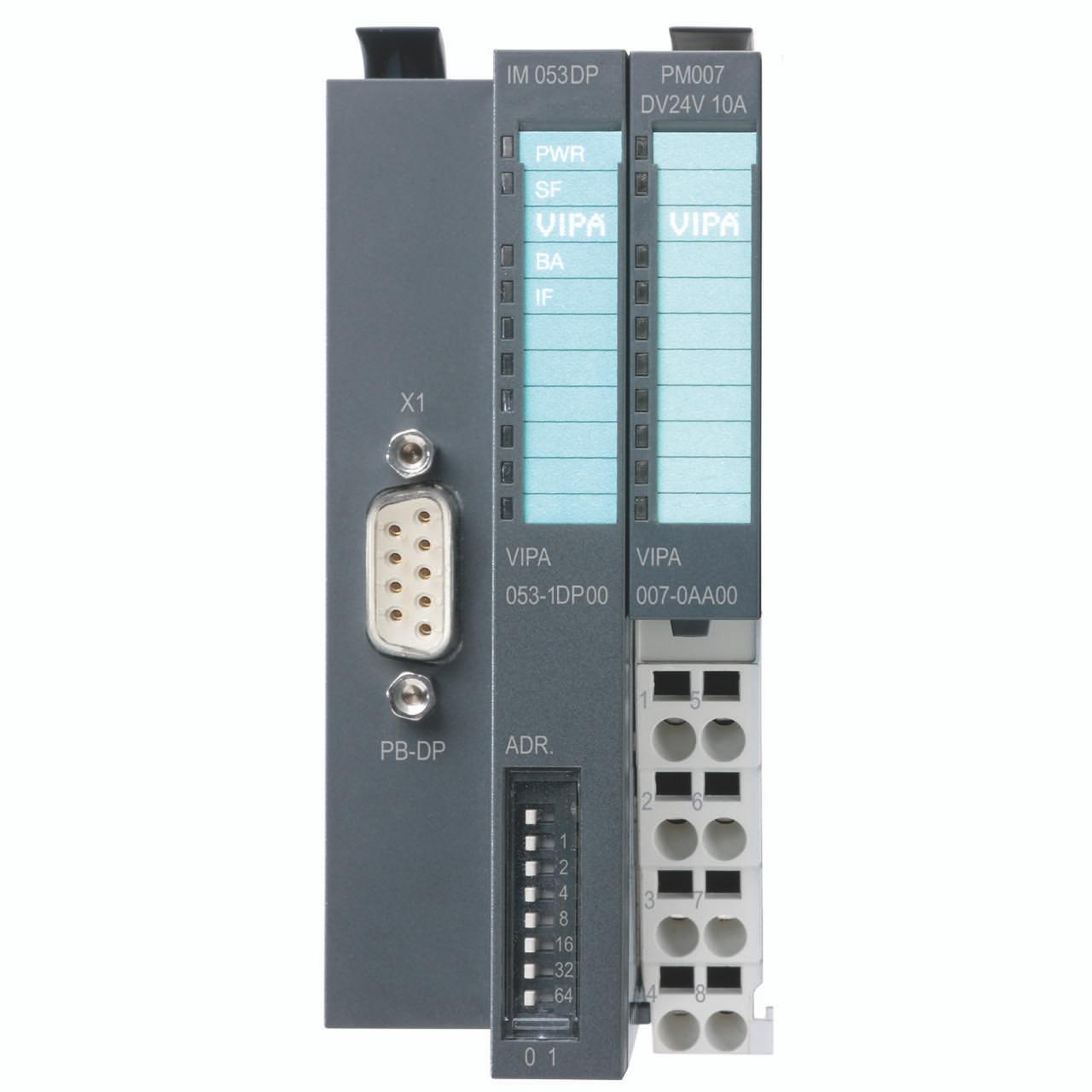 INTERFACE MODULE, PROFIBUS-DP SLAVE, IM 053DP, DP-V0 / DP-V1, 244 BYTE INPUT / OUTPUT, 244 BYTE PARAMETER DATA, DIAGNOSTIC FUNCTIONS, INTEGRATED 24 VDC SUPPLY, STATUS LEDS, UP TO 64 PERIPHERAL MODULES