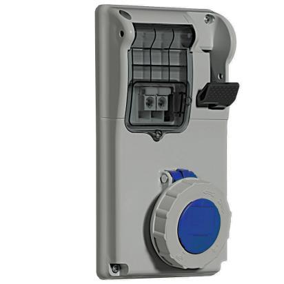 Compact interlocked socket outlet 2PT 125x220mm, IP55, IK08, In 16A, Vn200250Vac, blue. Prepared with protective fuses. Supplied without cable glands