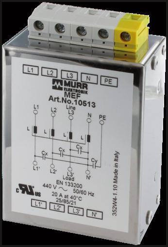 MEF mains filter 3-phase 1-stage with N I:20A U:4x440 VAC can be snapped on