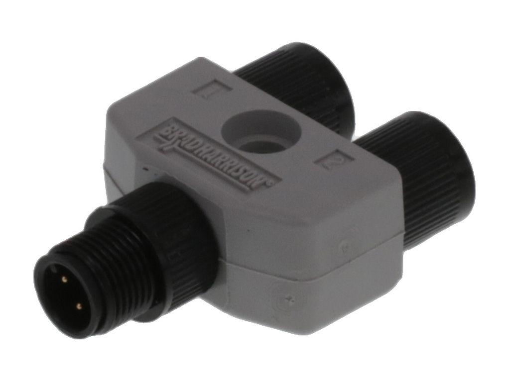 Micro-Change (M12) Solid Body Splitter, 1 x 4-Pole Male to 2 x 4-Pole Females, Grey PVC Overmold
