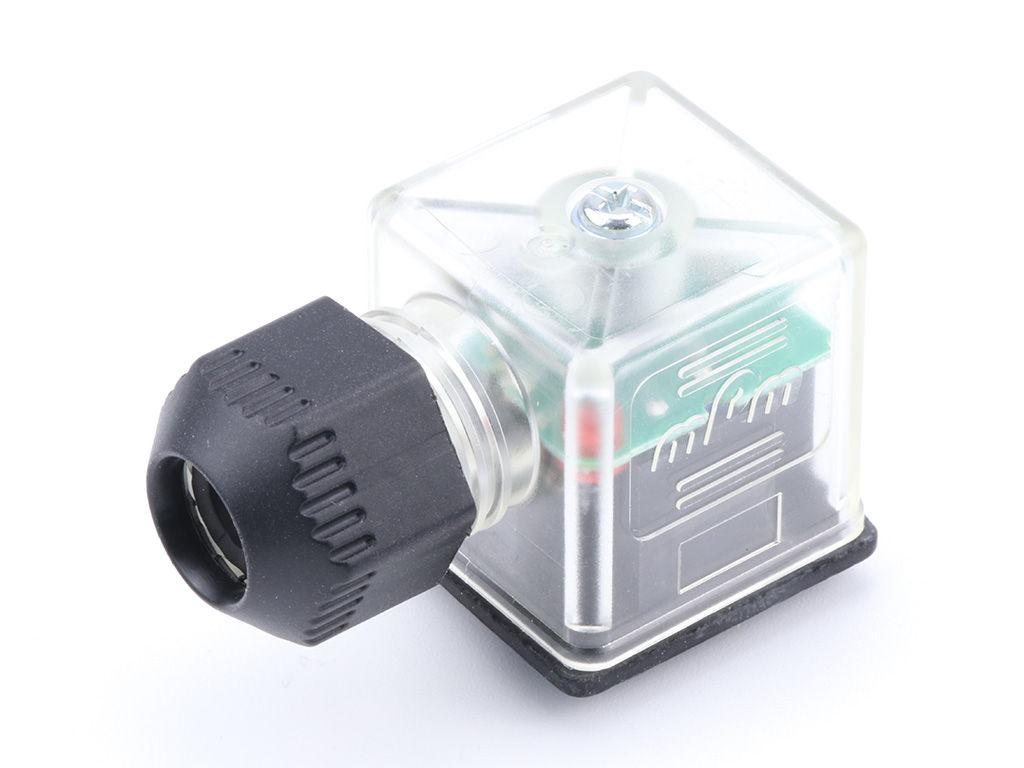 mPm DIN Valve Connector, Form A-18mm, External Threads, 2 Pole Plus Ground with C4 Circuit, 24V, Red LED + VDR, Transparent, Integrated NBR Gasket, Single Bag, Unmounted