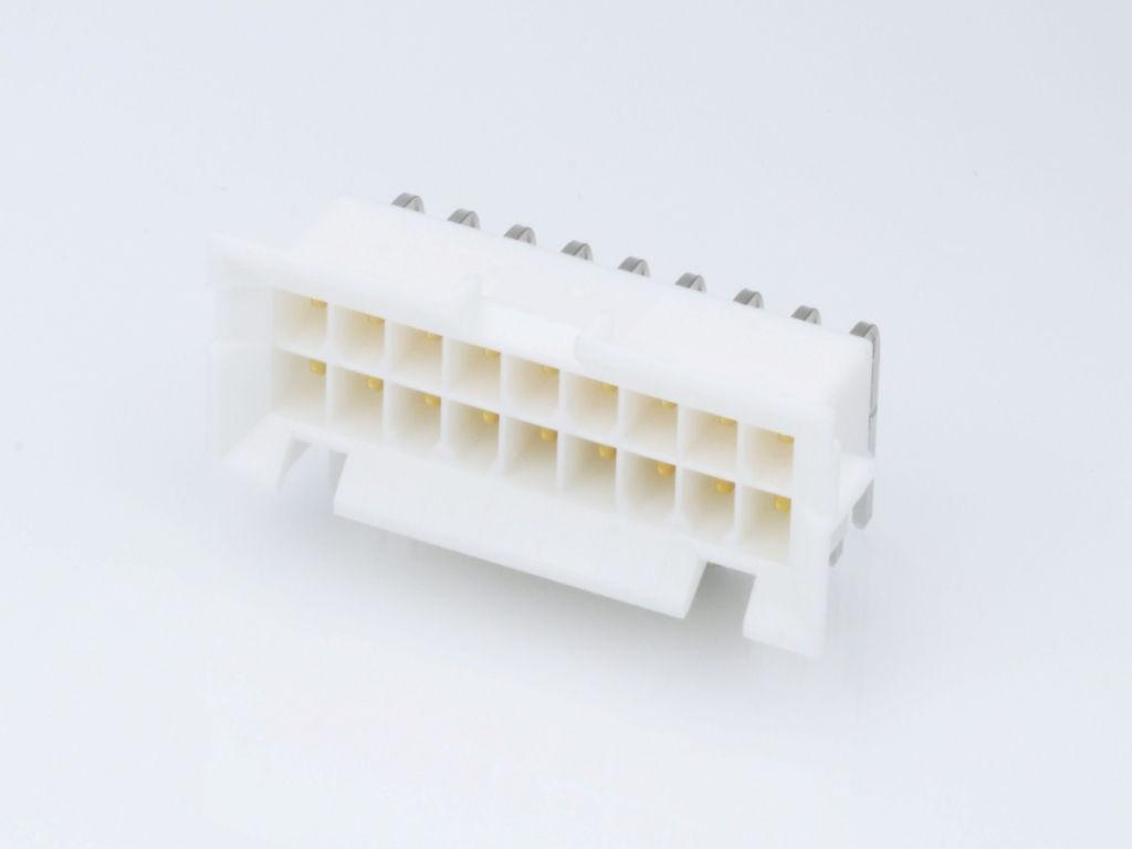Mini-Fit BMI Header, Dual Row, Right-Angle, with Snap-in Plastic Peg PCB Lock, 18 Circuits, PA Polyamide Nylon 6/6, UL 94V-0, with Select Gold (Au) Plating