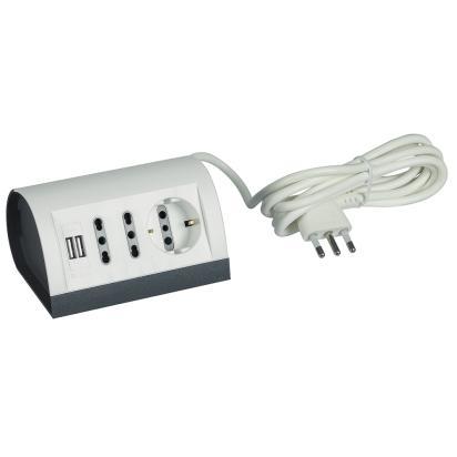 Pre-wired desk multisocket with 2 two-pin 1016A outlets, one German P30 outlet and two USB outlets powered 5V 1.5A max, with 2 m cable, 250 Va.c. white