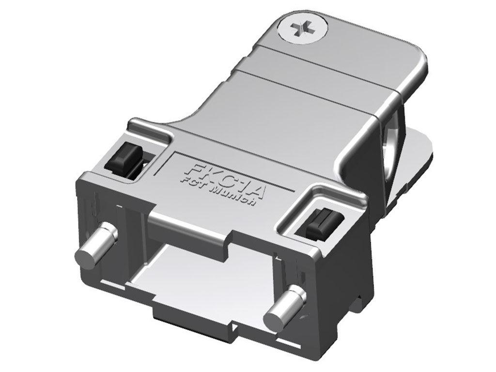 FCT Plastic Backshell for D-Sub Connector, Shielded, Shell Size 1, 70° Angle Cable Outlet, Large Inner Chamber, with 4-40 UNC Locking Screws