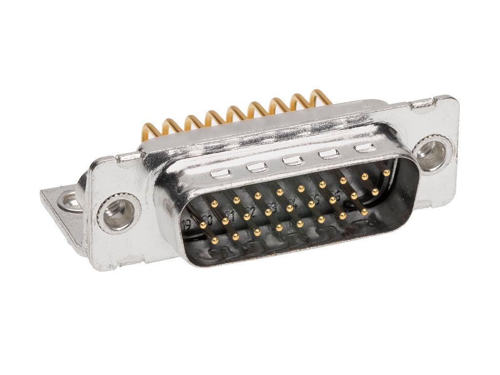 FCT High-Density D-Sub Connector, Male, Right-Angle, PCB Through Hole, Gold Plating, with Machined Contacts and Metal Bracket, 26 Circuits
