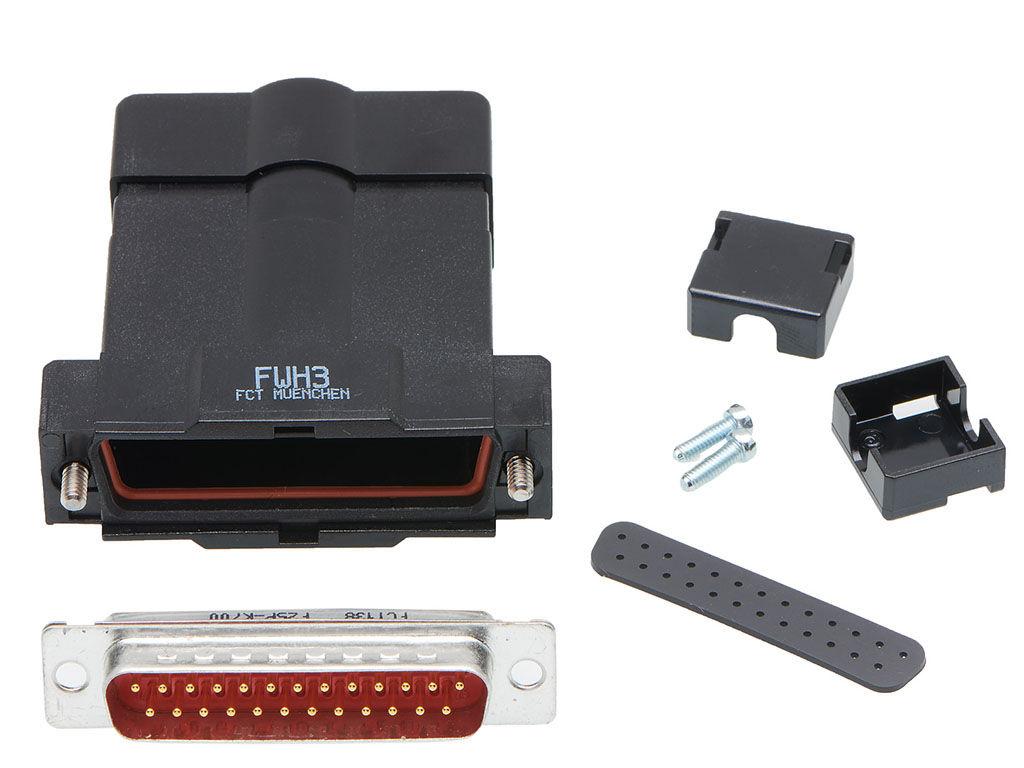 FCT Backshell Connector Kit, Black Plastic Backshell, Male Standard Density D-Sub Connector, 25 Circuits, Straight Cable Outlet, IP67 Waterproof