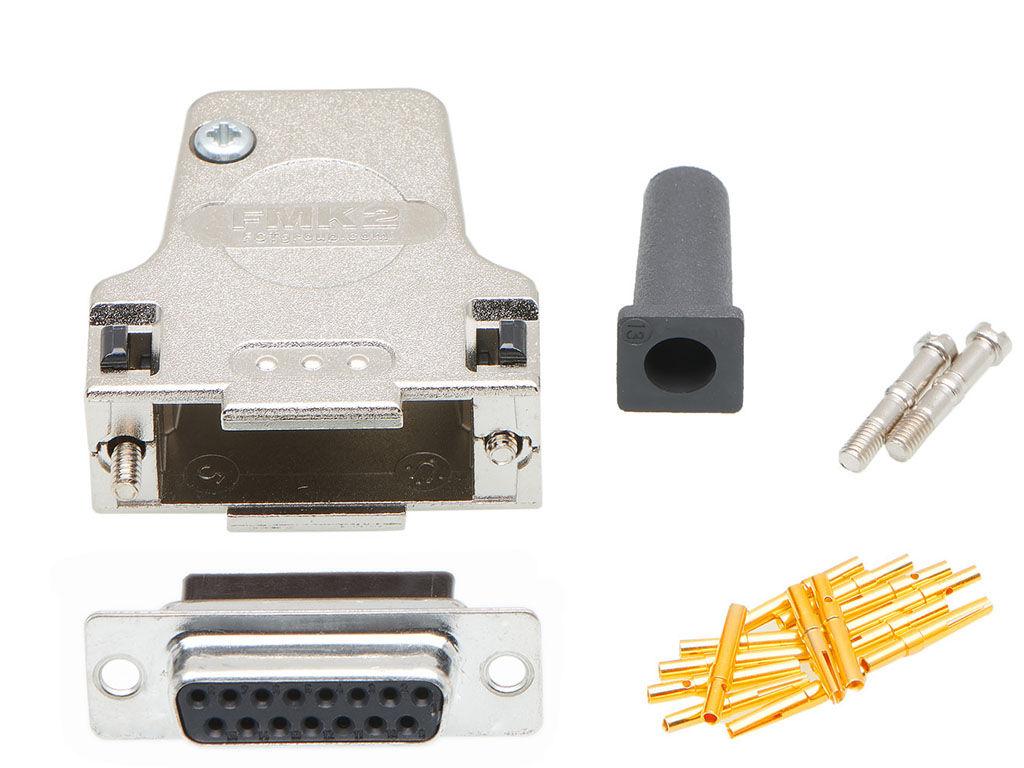 FCT Backshell Connector Kit, Metal Backshell, Female Standard Density D-Sub Connector, Machined Crimp Signal Contacts, 15 Circuits, 45° Angle Cable Outlet