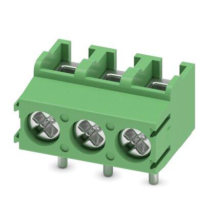 PCB terminal block, nominal current: 17.5 A, rated voltage (III/2): 400 V, nominal cross section: 1.5 mm2, number of potentials: 3, number of rows: 1, number of positions per row: 3, product range: PT 1,5/..-V, pitch: 5 mm, connection method: Screw connection with wire protector, mounting: Wave soldering, conductor/PCB connection direction: 90 °, color: green, Pin layout: Linear pinning, Solder pin [P]: 3.5 mm, number of solder pins per potential: 1, type of packaging: packed in cardboard