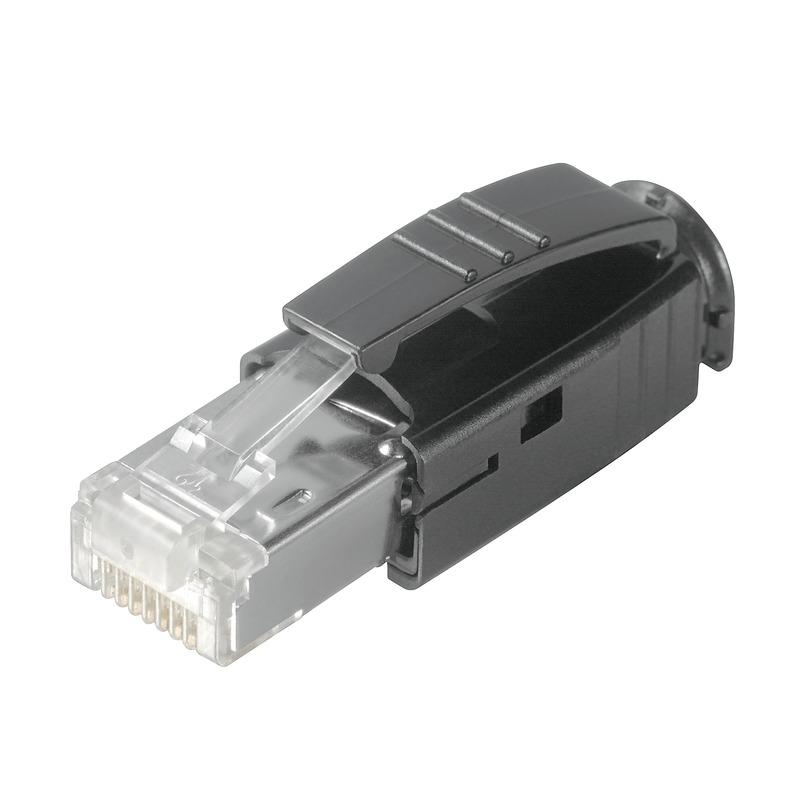 RJ45 crimp plug, Plug with bending protection sleeve in black, Cat.6A / Class EA (ISO/IEC 11801 2010)