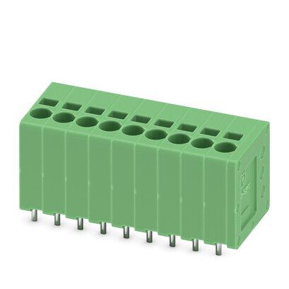PCB terminal block, nominal current: 17.5 A, rated voltage (III/2): 200 V, nominal cross section: 1.5 mm2, number of potentials: 9, number of rows: 1, number of positions per row: 9, product range: SPT 1,5/..-V, pitch: 3.5 mm, connection method: Push-in spring connection, mounting: Wave soldering, conductor/PCB connection direction: 90 °, color: green, Pin layout: Linear pinning, Solder pin [P]: 2.5 mm, number of solder pins per potential: 2, type of packaging: packed in cardboard