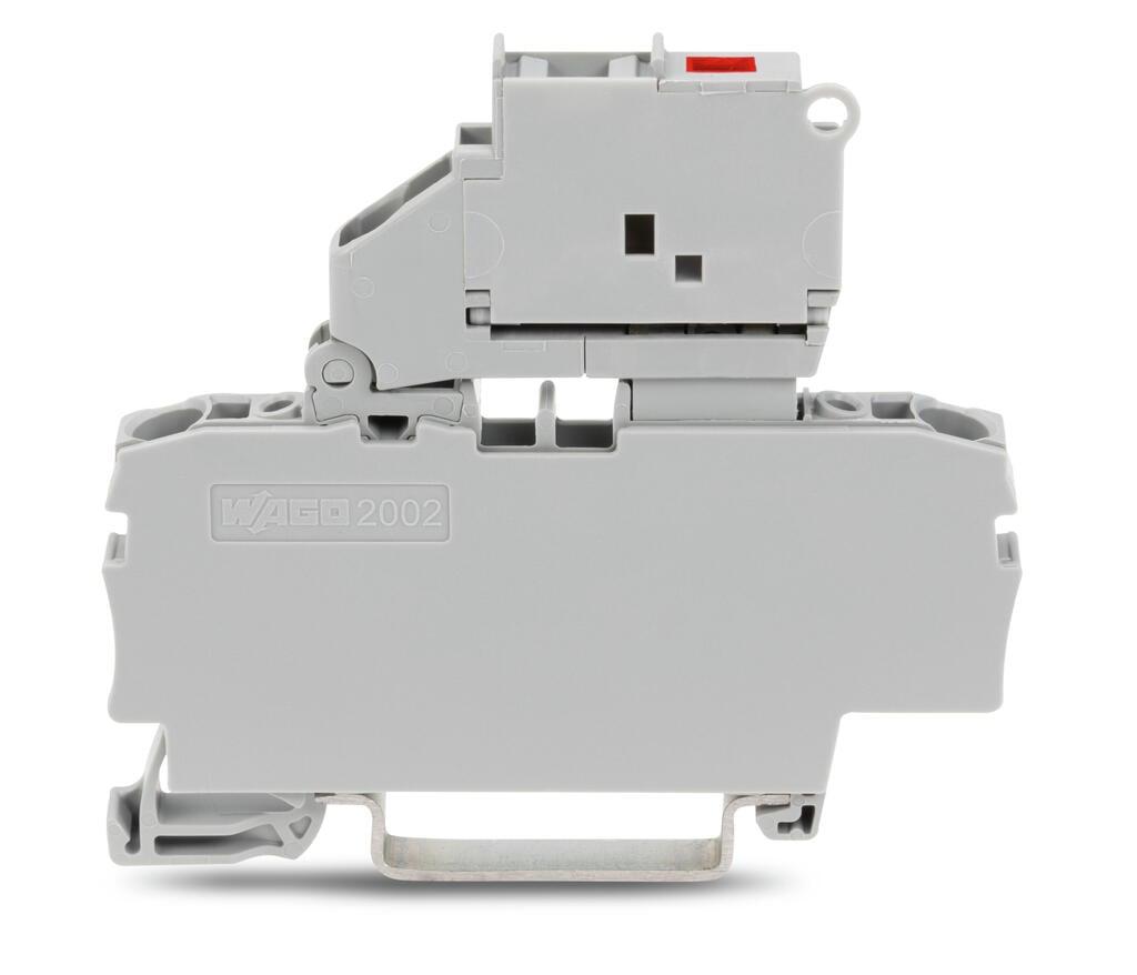 Fuse terminal block for 2 conductors with pivoting fuse holder with end plate for miniature fuse 5 x 20 mm with LED fuse failure indication 230 V for DIN rail 35 x 15 and 35 x 75 25 mm² Pushin CAGE CLAMP 250 mm² gray