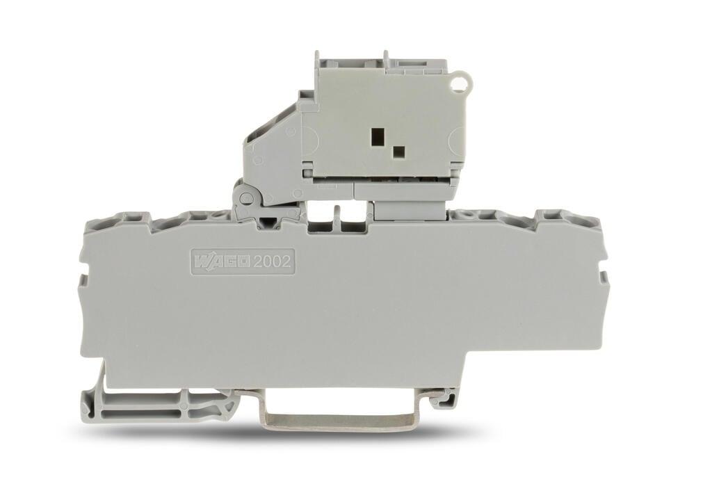 4-conductor fused terminal block with pivoting fuse holder and end plate for 5 x 20 mm miniature fuse without fuse failure indication for DIN rail 35 x 15 and 35 x 75 25 mm² Pushin CAGE CLAMP 250 mm² gray