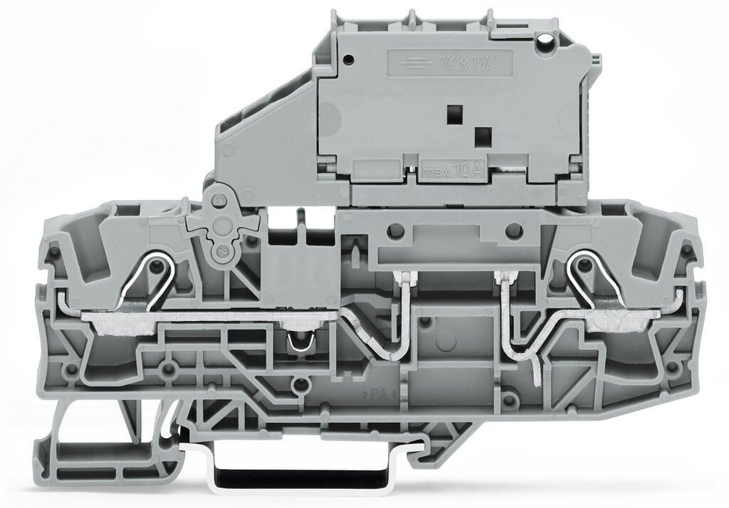 Fuse terminal block for 2 conductors with pivoting fuse holder for miniature fuse 14 x 1 14 mm without fuse failure indication for DIN rail 35 x 15 and 35 x 75 6 mm² Pushin CAGE CLAMP 600 mm² gray