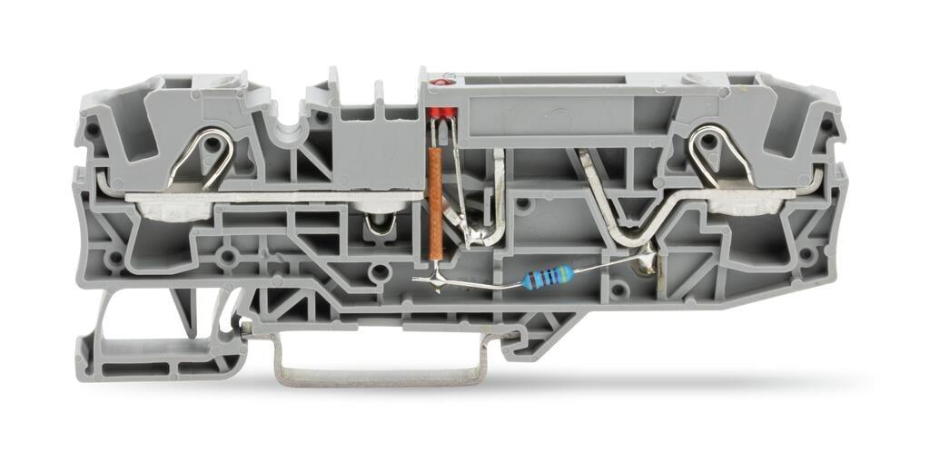 2-conductor fused terminal block for automotive blade fuses with test option with LED fuse blown indication 24 V for DIN rail 35 x 15 and 35 x 75 6 mm² Pushin CAGE CLAMP 600 mm² gray