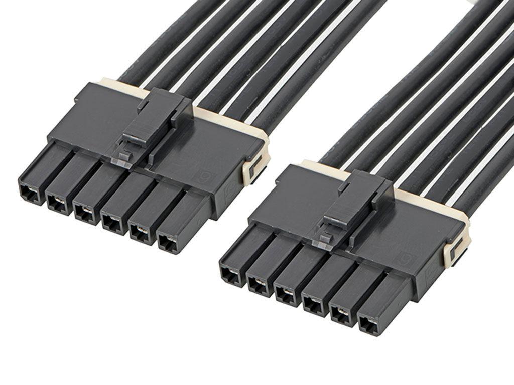 Mega-Fit Female-to-Mega-Fit Female Off-the-Shelf (OTS) Cable Assembly, Single Row, 600.00mm Length, Tin Plated, 6 Circuits, Black