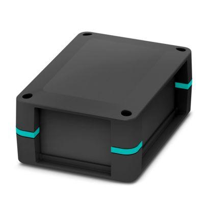 Complete housing for PCBs, can be positioned flexibly; includes housing half shells, side panels closed, adhesive domes for PCB attachment, screws for housing and PCB attachment; housing: black with turquoise blue corner inlays
