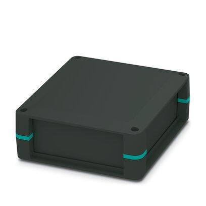 Complete housing for PCBs, can be positioned flexibly; includes housing half shells, side panels closed, adhesive domes for PCB attachment, screws for housing and PCB attachment; housing: black with turquoise blue corner inlays
