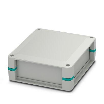 Complete housing for PCBs, fixed to the corner inlays, includes housing half shells, side panels closed, corner inlays with PCB attachment, screws for housing and PCB attachment, light gray housing with turquoise blue corner inlays