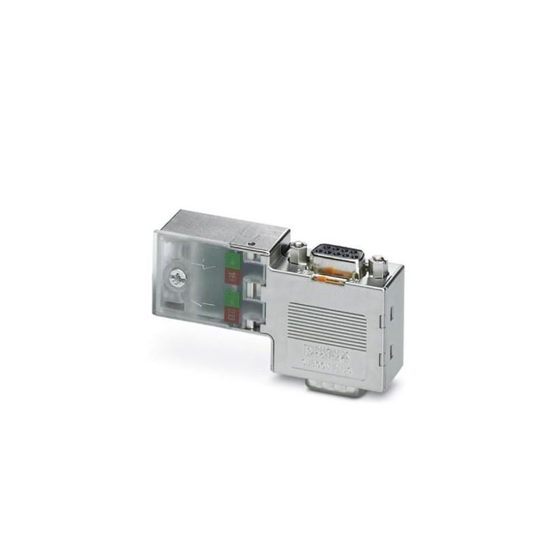 D-SUB connector, 9-pos., male connector, cable entry < 90, bus system: PROFIBUS DP up to 12 Mbps with PG D-SUB socket for connecting a programming device, termination resistor can be switched on via slide switch, pin assignment: 3, 5, 6, 8; screw connection terminal blocks
