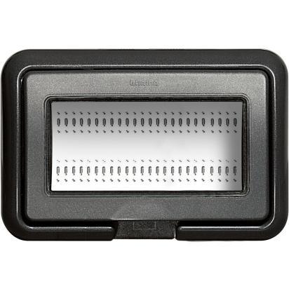 IP55 cover for recessed installation in 504E box of 4 LivingLight or Luna modules anthracite color. Note the IP55 degree of protection is obtained when the cover is closed and with item installed on smooth walls, without grooves and waterproof smooth tiles, marble