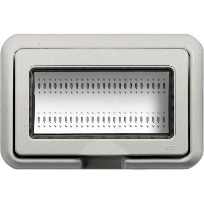 IP55 cover for recessed installation in 504E box of 4 LivingLight or Luna modules white color. Note the IP55 degree of protection is achieved when the cover is closed and with item installed on smooth walls, without grooves and waterproof smooth tiles, marble