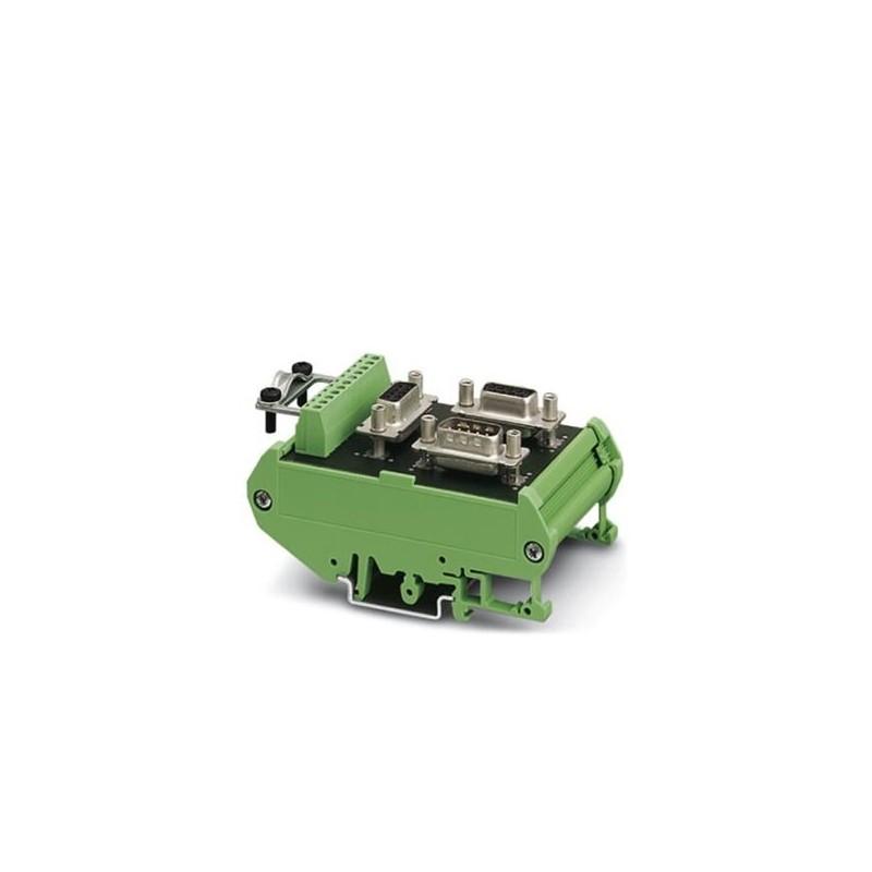 Passive RS-485 T-distributor, fitted with one 9-pin D-SUB pin strip and two 9-pin D-SUB socket strips