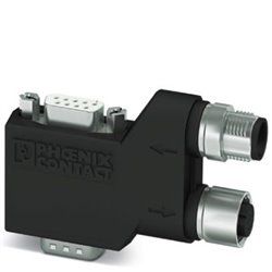 Plugue D-SUB, 9 polos, pino, com soquete PG-D-SUB, atribuição: 3, 5, 6, 8; dois prensa-cabos M12 (código B) abaixo de 90 °. Sistema de barramento: PROFIBUS DP até 12 Mbps. Resistor de terminação via terminador M12 separado.