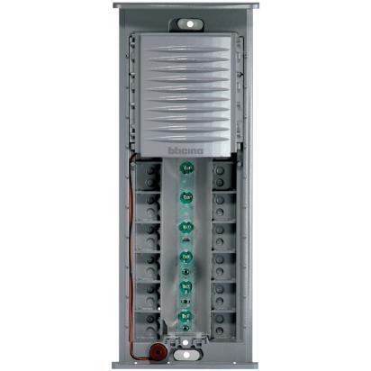 Minisphere analog phonic module prepared for up to 6 calls. Must be accessorized with contact block 332718, frame 332721 and buttons 332712, 332713, 332714, 332715. Equipped with microphone sensitivity and speaker volume adjustment. Connections to the system are made directly to the sound module terminal block. Name tags are illuminated by green LEDs.