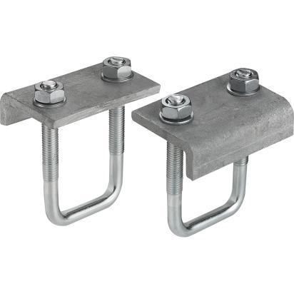 Beam attachment. Beam attachment suspension plates are supplied in pairs, complete with electrolytically galvanized U-bolts to be used for beams with a maximum fin thickness of 20 mm