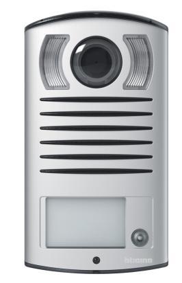 Linea 2000 handset. 2-wire technology, wall-mounted installation with aluminum front, color camera and white LED illumination for night shooting. One call button. Camera swivels on horizontal and vertical axes by 15. Allows activation of an electric lock connected directly between terminals S and S 18 V 4 A impulsive, 250 mA holding, 30 Ohm max. Green LED name tag illumination. IP54 degree of protection. IK07 degree of robustness.