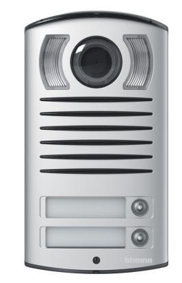Linea 2000 handset. 2-wire technology, wall-mounted installation with aluminum front, color camera and white LED illumination for night shooting. Two call buttons. Camera can be swiveled on horizontal and vertical axes by 15. Allows activation of an electric lock connected directly between terminals S and S 18 V 4 A impulsive, 250 mA holding, 30 Ohm max. Green LED name tag illumination. IP54 degree of protection. IK07 degree of robustness.