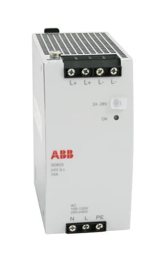 SD833 Power Supply, 10A. Input a.c. 100-120/200-240 V, auto-select input. Output d.c. 24 V 10A. If redundant power application is required connect to SD8XX voting unit. DIN rail mounted. G2 compliant.