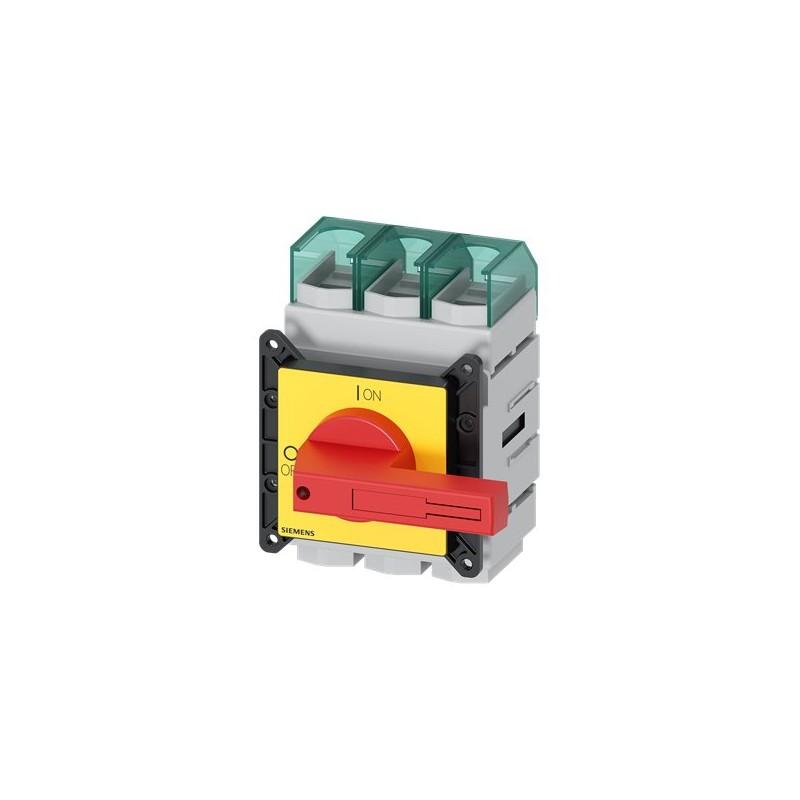 SENTRON, Molded case switch 3LD5 UL, Emergency switching-off, 3-pole, certified according to UL489 UL60947-4-1 and IEC60947-3, UL: 150A, SCCR 50kA at 480VAC, Operating power at 480VAC 3-phase: 100hp, IEC: 160A, Operating power at AC-23A at 400V: 75kW, front-mounted, rotary operating mechanism, red/yellow, 4-hole mounting of the handle, incl. terminal covers for the infeed side