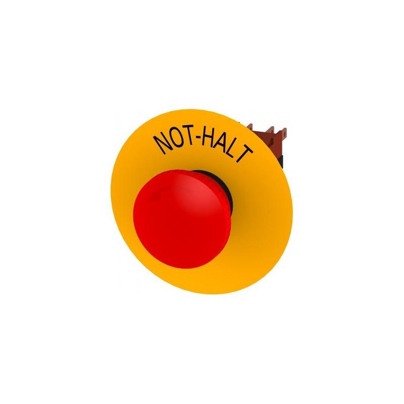 Emergency stop mushroom pushbutton, 16 mm, round, plastic, red, latching, with rotate-to-unlatch mechanism, according to ISO 13850, 1 NC, with yellow backing plate, EMERGENCY STOP