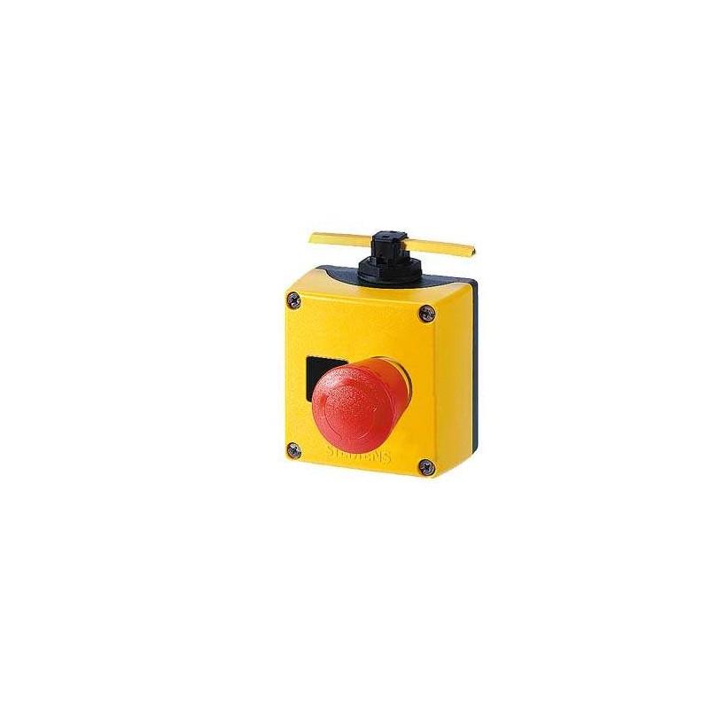 AS-Interface enclosure for command devices, 22 mm, round, Enclosure material metal, Enclosure top part yellow, without protective collar, 1 control point, A=emergency stop mushroom pushbutton red, 40 mm, rotate-to-unlatch, 1 NC, 1 NC, Cable gland for shaped cable top