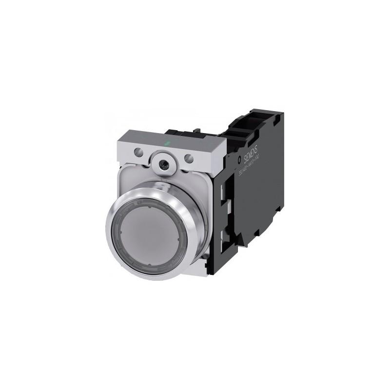 Illuminated pushbutton, 22 mm, round, metal, shiny, clear, pushbutton, flat, momentary contact type, with holder, 1 NO+1 NC, LED module with integrated LED 230 V AC, screw terminal