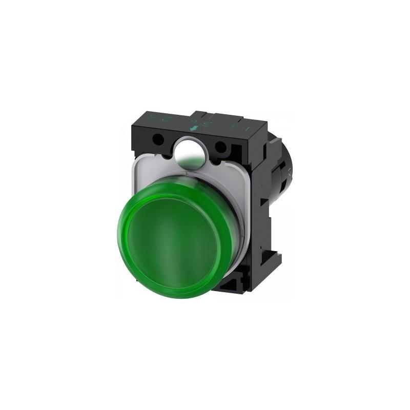 Indicator lights, compact, 22 mm, round, plastic, green, lens, smooth, with holder, Operating voltage 110 V AC, screw terminal