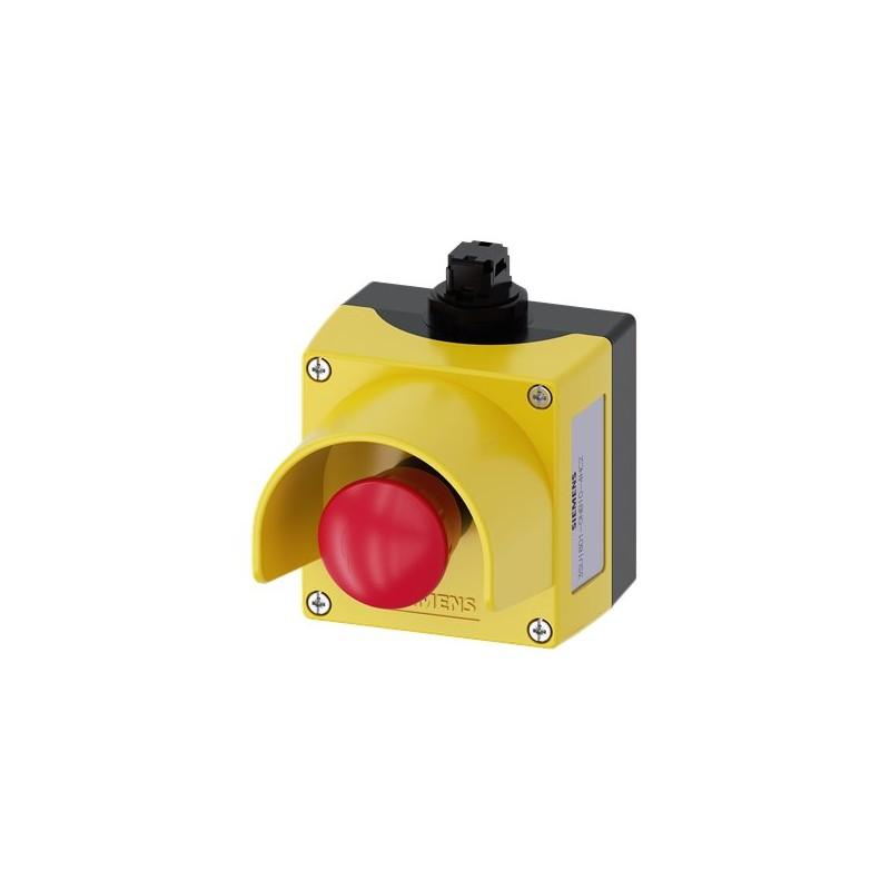 AS-Interface enclosure for command devices 22 mm, round, Enclosure material plastic, Enclosure top part yellow, with protective collar, 1 control point plastic, A=EMERGENCY STOP mushroom pushbutton red, 40 mm, rotate-to-unlatch, 1 NC, 1 NC, spring-type terminal, floor mounting, Insulation displacement system on top