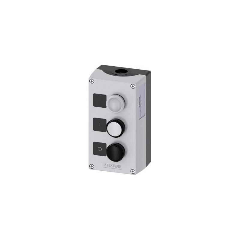 Enclosure for command devices, 22 mm, round, Enclosure material plastic, enclosure top part gray, 3 control points plastic, C=indicator light clear, label, LED 24 V, screw terminal, B=pushbutton white, label: I, 1 NO, screw terminal, A=pushbutton black,Label: O, 1 NC, screw terminal, floor mounting, 1xM20 each on top and bottom