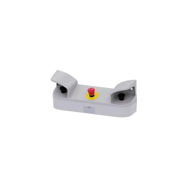 Two-hand operation console for command devices, 22 mm, round, Enclosure material plastic, enclosure top part gray, 3 control points plastic, 8 additional reference holes for 22 mm command devices 2 mushroom pushbuttons black 40 mm, 2x1NO+1NC, screw terminal, 1 EMERGENCY STOP red, 40 mm, 2 NC, screw terminal, Front mounting, with cable cut-outs for metric screw connections