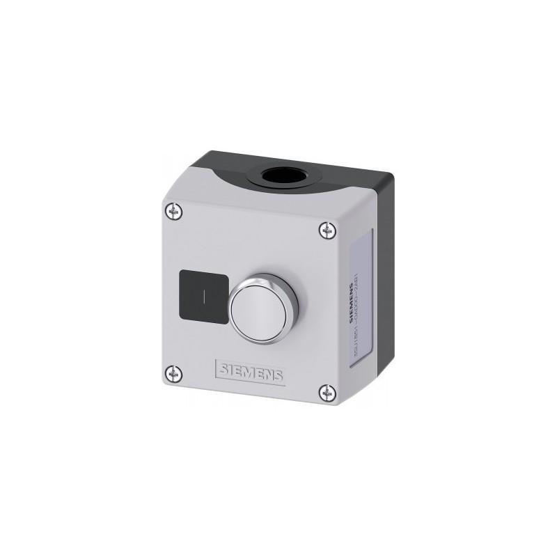 Enclosure for command devices, 22 mm, round, Enclosure material metal, enclosure top part gray, 1 control point metal, A=pushbutton white, 1 NO, screw terminal, floor mounting, label: I, 1xM20 each on top and bottom