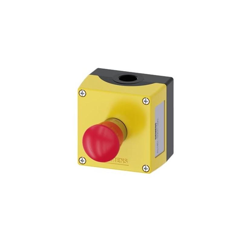 Enclosure for command devices, 22 mm, round, Enclosure material metal, Enclosure top part yellow, 1 control point metal, A=EMERGENCY STOP mushroom pushbutton red, 40 mm, rotate-to-unlatch, Control point in center, 1 NC, screw terminal, floor mounting, 1xM20 each on top and bottom