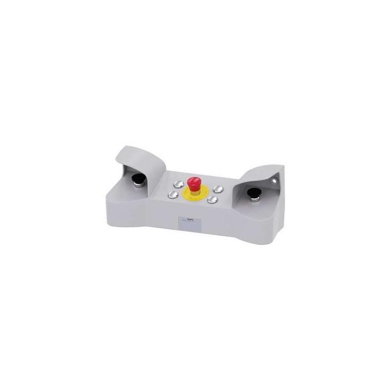 Two-hand operation console for command devices, 22 mm, round, Enclosure material metal, enclosure top part gray, 3 control points metal, 4 additional drilled holes for 22 mm command devices 2 mushroom pushbuttons black 40 mm, 2x1NO+1NC, screw terminal, 1 EMERGENCY STOP red, 40 mm, 2 NC, screw terminal, Front mounting, with cable cut-outs for metric screw connections