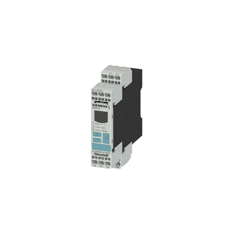 Digital monitoring relay for residual current monitoring (with current transformer 3UL23) Setting range 0.03...40 A separate for warning threshold and switch-off value supply voltage 24 ... 240 V AC/DC, 50 .. 60Hz ON delay and tripping delay 0.1 to 20 s Shutdown hysteresis up to 50% Warning hysteresis 5% fixed Width 22.5 mm, 2 change-over contacts with or without fault buffer spring-type connection system