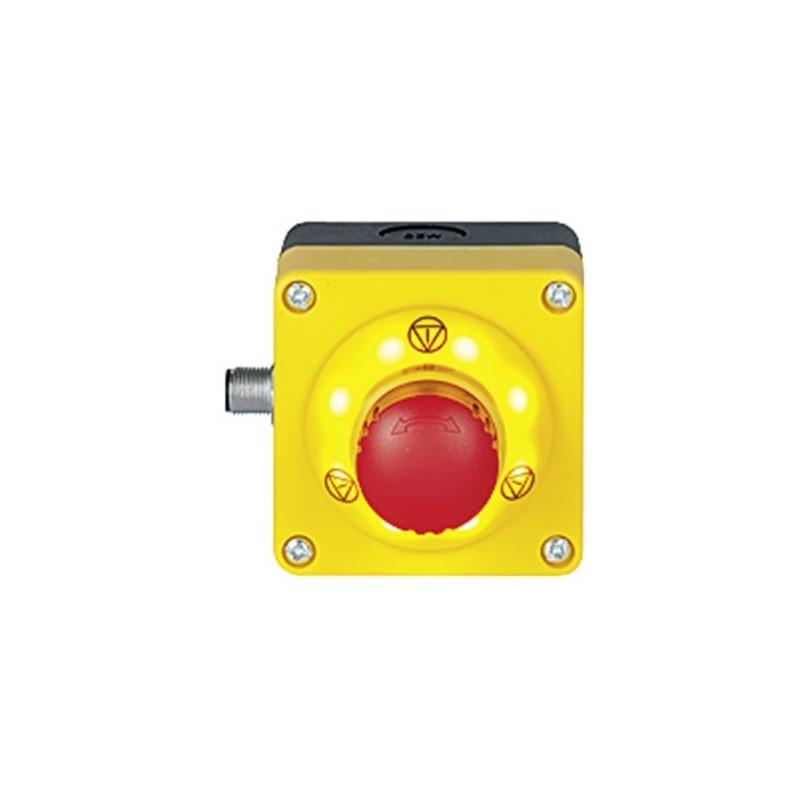 PITestop E-STOP/contact block incl. surface mount housing, set consisting of illuminated E-STOP pushbutton with E-STOP symbol and with E-STOP symbol and with logo and contact block, 2 N/C, with M12 connection 5-pin.