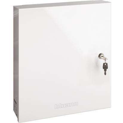 White metal case size 325x400x90 mm WxHxD with side opening and key lock, equipped with fuse holder and 2A fuse and 3A switching power supply already wired, ideal for central unit art. 4201C and art. 4203C. To be completed with 12V 18Ah backup battery, not included.