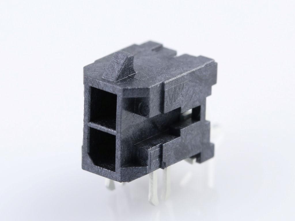 Micro-Fit 3.0 Right-Angle Header, 3.00mm Pitch, Dual Row, 2 Circuits, with PCB Press-fit Metal Retention Clip, Tin, Glow-Wire Capable, Black, Tape and Reel