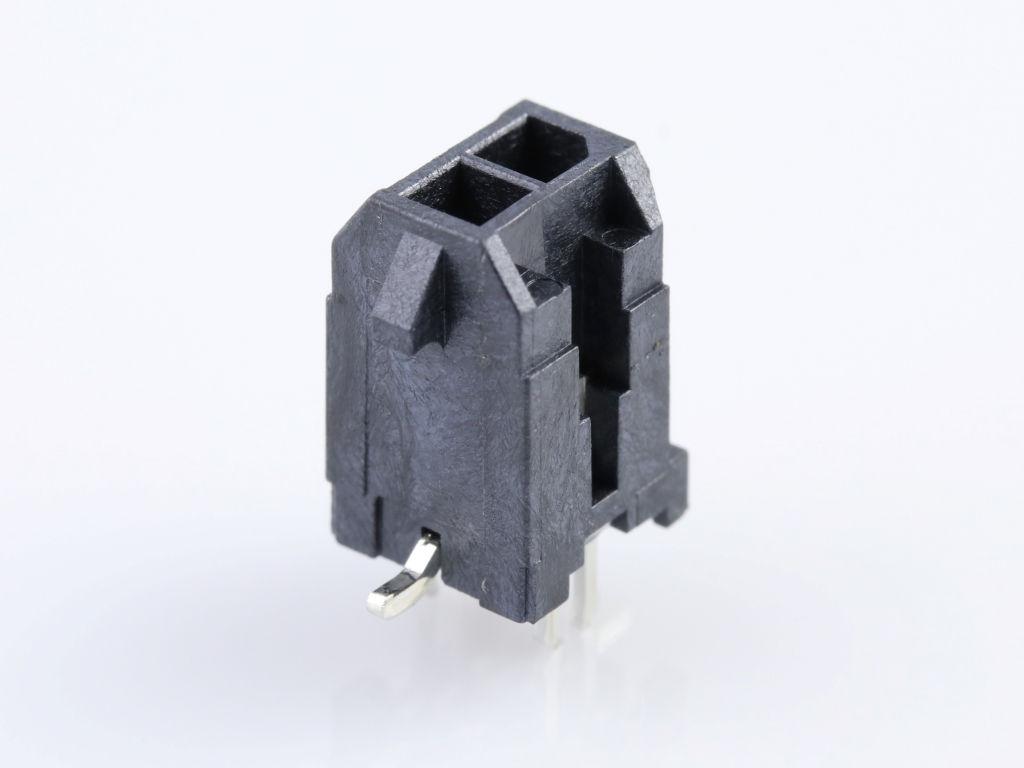 Micro-Fit 3.0 Vertical Header, 3.00mm Pitch, Dual Row, 2 Circuits, with PCB Press-fit Metal Retention Clip, Tin, Glow-Wire Capable, Black, Tape and Reel