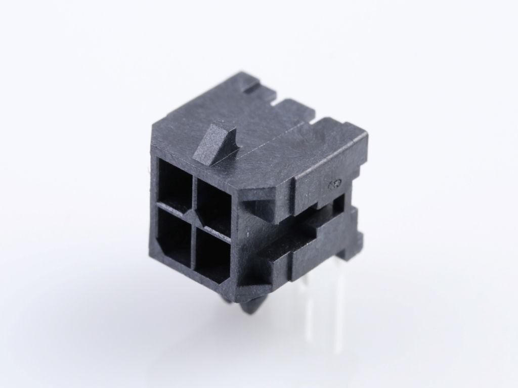Micro-Fit 3.0 Right-Angle Header, 3.00mm Pitch, Dual Row, 4 Circuits, with Snap-in Plastic Peg PCB Lock, Tin, Glow-Wire Capable, Black